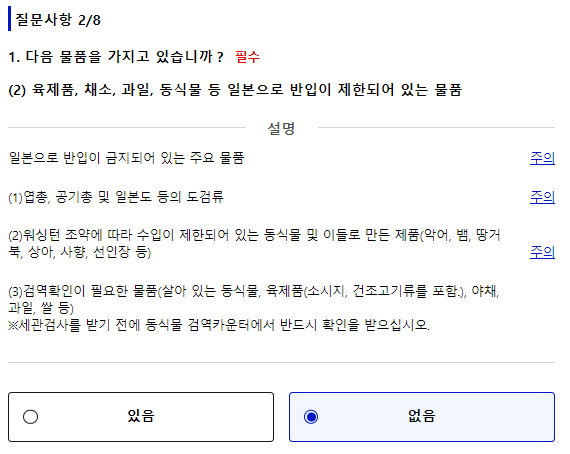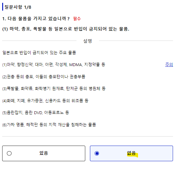일본 입국시 반드시 답변해야 할 질문 사항입니다. - 일본에서 강제퇴거 및 출국 명령에 의해 출국한 일, 상륙 거부 경험 - 일본국 및 이외의 나라에서 형사사건으로 유죄판결을 받은 일이 있는지 - 위험물: 마약, 대마, 아편, 각성제 등의 규제약물, 총포, 석궁, 도검류 및 화약류 소지 여부 - 해당 위험물 소지시 관련 법에 의거해 출국 조치 및 법에 대응하는 조치를 받으실 수 있으니 특별히 조심하셔서 위험물은 애초부터 소지하지 않으신 채로 입국하시길 바랍니다! 모두 아니오를 클릭 후 다음으로 진행합니다. |