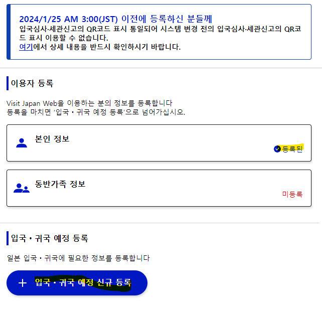 보시면 본인 정보는 입력이 완료 되었구요, 이제 입국/ 귀국예정을 신규로 등록하시면 됩니다. **주의 위에 공지사항을 보시면 2024년 1월 25일부터는 입국심사 및 세관신고의 QR코드가 통일되었다고 나와 있습니다. 이전까지는 입국심사, 세관신고 QR코드가 따로 있어서 불편했지만, 하나의 코드로 통일되었다고 하니 참조하시어 입국심사/ 세관신고 시 같은 QR 코드를 사용해 주시면 될 것 같습니다. |