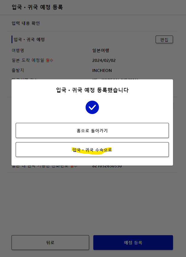 아직 프로세스가 더 남았습니다. 입국/ 귀국 수속을 눌러 다음으로 진행합니다. |
