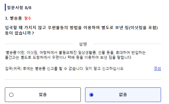 이사짐이나 별송품이 있으신 경우에는 반드시 신고하셔야 되지만, 여행 목적으로 캐리어 하나만 들고 가시는 경우에는 별도의 신고가 필요 없습니다. |