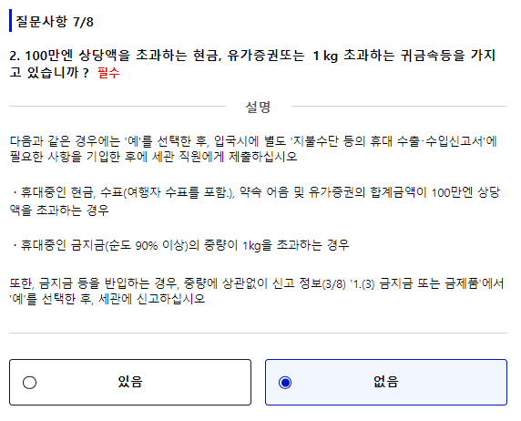 100만엔 상당의 현금, 1kg을 초과하는 귀금속 등은 신고 대상입니다. |